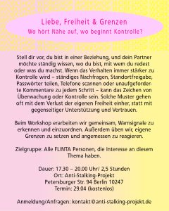 Zeige grösseres Bild 29.04.2026: Workshop – Liebe, Freiheit und Grenzen – Wo hört Nähe auf, wo beginnt Kontrolle! WORKSHOP: Liebe, Freiheit und Grenzen – Wo hört Nähe auf, wo beginnt Kontrolle! Von |2026-04-01T15:42:45+02:0016.April 2024|Aktuell|0 Kommentare Share This Story, Choose Your Platform! FacebookXRedditLinkedInTumblrPinterestVkE-Mail Über den Autor: Hinterlasse einen Kommentar Antwort abbrechenDu musst angemeldet sein, um einen Kommentar schreiben zu können.